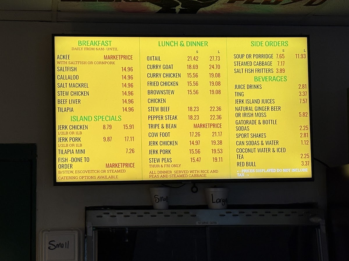 Guests can enjoy these flavorful meals throughout the day, whether stopping in for a midday bite or settling in for an evening meal. Alongside the savory entrees, the menu includes traditional sides such as steamed cabbage and plantains that complement the main dishes, creating a well-rounded and satisfying experience.
